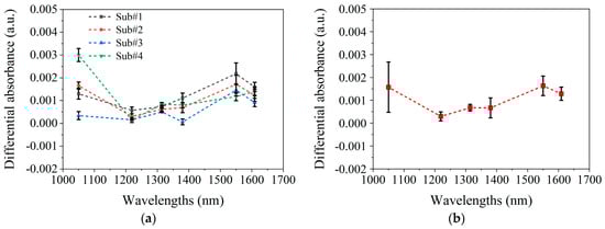 Figure 7a presents the final blood spectra for each of the four subjects, which were averaged from three blood spectra acquired from three arm elevation operations. Figure 7b shows the average final blood spectra and variations among subjects.