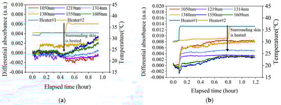 As can be seen from Figure 9a, after heating the natural skin temperature to 32.5 °C, the at all six wavelengths remained stable, with fluctuations less than 0.001 a.u. over a period of 20 min. In addition, when the skin condition is stable, applying external blood flow disturbance (heating the adjacent skin area) will affect the blood flow state of the local skin, thereby causing spectral changes. Among them, the changes at 1550 nm and 1609 nm are more significant. At the wavelengths of 1050 nm, 1219 nm, and 1314 nm, where blood flow absorption is more obvious, most of the effects of blood flow are eliminated after differentiation.