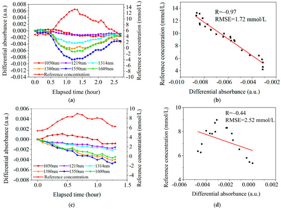 In contrast, among the 21 OGTT experiments without blood flow pre-stimulation, only 1 case had a correlation coefficient R > 0.85, and as many as 14 cases had a correlation coefficient R < 0.5, with a larger RMSE of 6.12 mmol/L. Figure 10c,d show one classical case of the experimental results with the skin temperature controlled at 32.5 °C. In Figure 10d, the correlation coefficient R is 0.44 and the RMSE is 2.52 mmol/L.