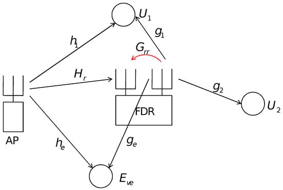 We assume that all the system nodes (AP, FDR, , , and Eve) are synchronized in time and frequency so that the received signals at the cooperative FDR, at , at Eve, and at at time slot n are expressed, respectively, as
