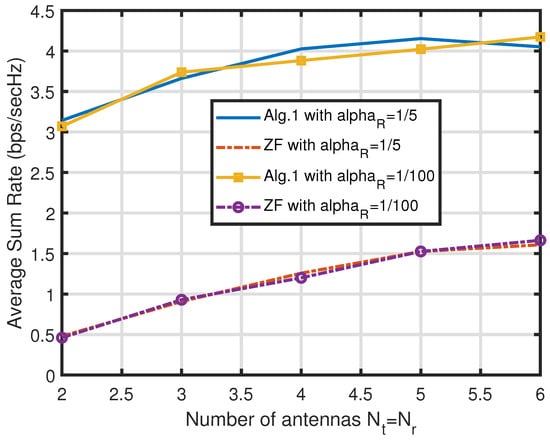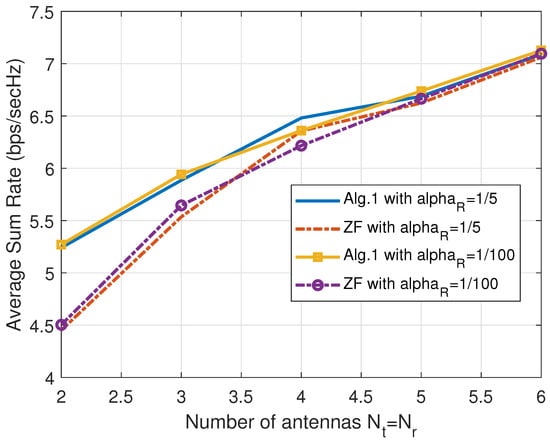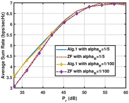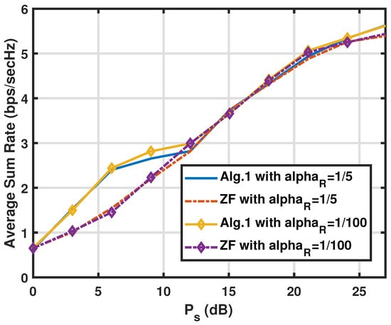In this subsection, we analyze the average sum rate () performance of the proposed CNOMA transmission with the FDR mode of Algorithm 1 and Algorithm 2, respectively, in different parameter configurations. Here, we have two users (, ), two values of path-gain of the SI link as or and when the analogue SIC circuit at the FDR removes a considerable amount of SI. The specific parameter value settings for the FDR relaying scenario follow those in [35] with . The assumption that all the elements of the channel vectors are i.i.d complex Gaussian variables implies the flat fading channel with Rayleigh distribution. The sum rates of the two algorithms are presented in Figure 2 against the source transmit power (first-hop link) with two different values (i.e., different SI link conditions) and the FDR power for the CNOMA FDR case. Overall, the comparison of the curves shows that the Algorithm 1 does not perform better than the ZF scheme (in Algorithm 2) until increases over . This implies that the ZF-based scheme is enough in the regime with being less than since the SINRs at and are weaker than the one at in the regime. Also, note that with the variation of the value, it does not make a noticeable difference to say that the remaining SI after the analogue SIC is effectively removed by both algorithms and that the spectrally efficient merit from the full duplex operation is collected without much toll.