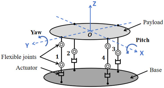 The structural schematic diagram of the integrated vibration isolation and pointing platform is illustrated in Figure 1. The platform primarily comprises a payload, four legs with vibration isolation and pointing capabilities, and a base. Each leg incorporates an actuator, two flexible joints, and connecting components. To achieve decoupling in the pitch and yaw directions, the four legs are arranged at 90° intervals along the same circumference.