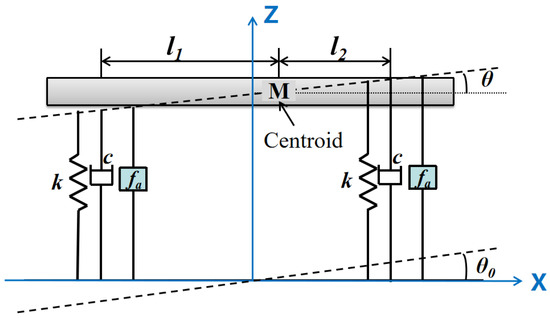 The integrated vibration isolation and pointing platform has a decoupling design and exhibits symmetry, allowing for its simplification into a two-degree-of-freedom dynamic system as illustrated in Figure 2. The figure depicts rotation around the Y-axis, specifically motion in the yaw direction. represents the axial stiffness of the elastic element on the leg, denotes the damping, signifies the electromagnetic driving force, indicates the input disturbance angle, and is the rotation angle of the payload.