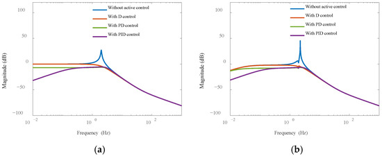 The system parameters of the model are: = 260 , = 20,000 N/m, = 70 N·s/m, = 40.49 kg·m2. Figure 3 illustrates the closed-loop transfer amplitude–frequency characteristic diagrams obtained using the differential (D), proportional–derivative (PD), and PID controllers under and . The rotational frequency of the vibration isolation system is low, specifically at 2 Hz, due to the small stiffness and large moment of inertia of the payload. Consequently, without active control, the vibration isolation system functions as a passive system capable of suppressing high-frequency vibrations. However, a relatively large peak occurs at the fundamental frequency. The D controller reduces amplitudes around the fundamental frequency, demonstrating the effect of active damping force. The PD controller not only exhibits a damping effect but also increases stiffness, improving control over low-frequency disturbances. The PID controller more effectively reduces amplitude at low frequencies. When the eccentricity coefficient is (Figure 3b), the system frequency changes to 2.25 Hz, but the control effect remains largely unaffected, indicating that the deviation of the center of mass from the geometric center does not significantly impact the control effect in closed-loop vibration isolation.