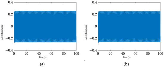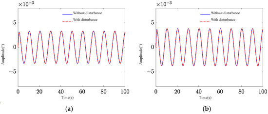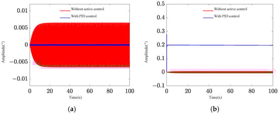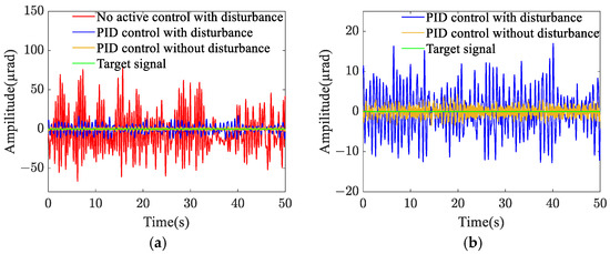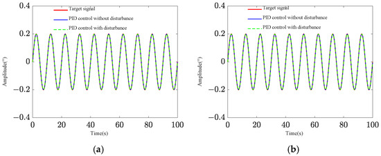 Two pointing scenarios are analyzed: fixed-point pointing at 0° and 0.2°, and sinusoidal tracking pointing at 0.2 × sin (0.2πt)° under 0.1 Hz. A sinusoidal disturbance signal of 5 × sin (4πt) μrad at the fundamental frequency is applied to the base, and the tracking and pointing effects of both scenarios under the disturbance condition are examined (Figure 4 and Figure 5). The results demonstrate that the platform can achieve target tracking with and without disturbance using PID control. The maximum errors of sinusoidal pointing are 1.65% (Figure 6a) and 1.90% (Figure 6b) under and , respectively. The reason why the difference between sinusoidal pointing control with and without disturbances cannot be seen in the curve is mainly because the amplitude of the tracked signal differs too much from the amplitude of the response caused by the disturbance. The disturbance amplitude is 5 µrad, and the response amplitude caused by the disturbance is approximately 0.25 µrad under PID control, as shown in Figure 7. However, the amplitude of the tracked signal is 0.2°, which is 3490 µrad. They are not on the same scale in the image, so it will have a small impact on the tracking results from the curve.