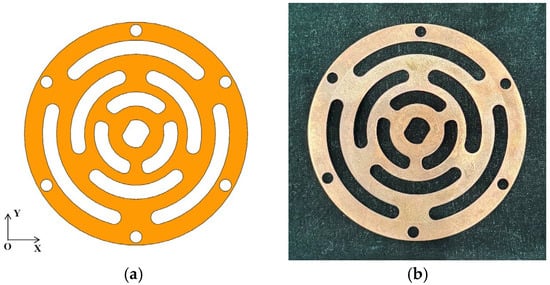 To achieve relatively low axial stiffness and high radial stiffness in the legs while preventing collisions and friction between the coils and magnetic steel in the voice coil motor, a double membrane design is implemented for the actuator. The stiffness of a single membrane is approximately 10,000 N/m. In order to ensure low axial stiffness and minimizing the maximum stress, the membrane with the multi-layer winding pattern in ref. [30] is designed as illustrated in Figure 8 and is manufactured through wire cutting processing. The membrane is made of beryllium bronze, a material chosen for its high strength, hardness, elastic limit, and fatigue resistance. Additionally, beryllium bronze exhibits minimal elastic hysteresis and remains unaffected by magnetic fields.