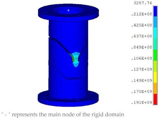 The joint is a crucial component that connects the legs with the payload and lower platform, facilitating flexible payload movement. To achieve seamless, frictionless, and high-precision rotation of the payload, the flexible joint in ref. [30] is employed, as shown in Figure 11. Steel is selected as the material, and the internal channels are processed by wire-cutting with slow-traveling wire electrical discharge machining. When the pitching or yawing angle of the platform reaches 0.2°, the bending moment acting on the X-axis of the flexible joint is approximately 2.6 N·m. The bending stress of the flexible joint is analyzed using the finite element method. Initially, a fixed constraint is applied at one end of the flexible joint. A key point is established at the center of the other end of the joint, and a rigid domain is created. Bending moments with a magnitude of 2.6 N·m are applied to the key point. Figure 12 demonstrates the finite-element analysis results. The analysis reveals that the maximum stress of the flexible hinge appears at the center of the joint, with a value of 191 MPa, indicating that the bending deformation remains within the purely elastic range.