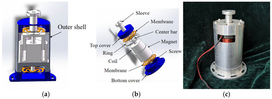 Figure 13a,b present the three-dimensional (3D) schematic diagram of the designed actuator, while Figure 13c displays a photograph of the actual device. The actuator’s central bar is attached to the upper and lower membranes, enabling low axial stiffness and comparatively high radial stiffness. This design allows for axial movement of the coils while preventing collisions and friction with the permanent magnets. The sleeve and coil, also connected to the central bar, constitute the moving components. The stationary elements, including the top cover, ring, magnet, outer shell, and bottom cover, are securely fastened in sequence, with the bottom cover firmly attached to the base.