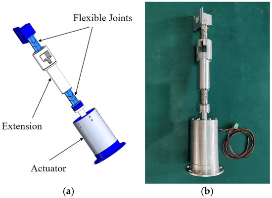 The model and photograph of the single-leg configuration are presented in Figure 14. The upper flexible joint is connected to the payload via a square adapter. An extension bar is positioned between the two flexible joints. The lower flexible joint is attached to the actuator through a connecting piece. The leg’s lower end is affixed to the platform’s base.