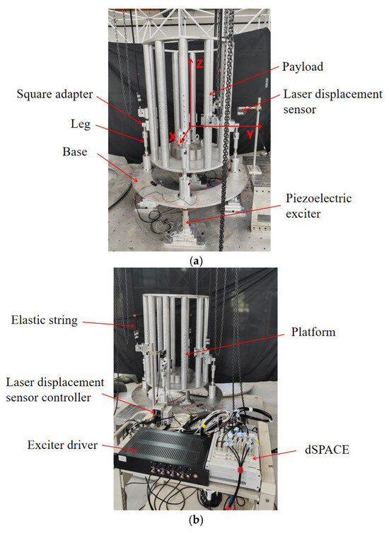 Figure 16 illustrates the experimental setup for this integrated vibration isolation and pointing platform. To mitigate gravitational effects, the payload model is suspended using elastic strings. The gravity unloading frequency is approximately 0.4 Hz, which is 1/5 of the fundamental frequency. Four high-thrust piezoelectric actuators, installed at the platform base’s bottom, serve as the micro-vibration simulation disturbance source. A laser displacement sensor indirectly measures the payload rotation angle, which is calculated using the measured displacement and the load’s radius. The control algorithm is developed using MATLAB/Simulink R2023b and subsequently compiled and evaluated using dSPACE ControlDesk 2020 to assess control effectiveness. Concurrently, dSPACE facilitates sensor signal acquisition and voltage signal transmission. The custom-designed current drive primarily converts voltage signals into current signals to drive the actuator. Given the symmetry of motion in the pitch and yaw directions, the vibration isolation and pointing control are verified using pitch direction movement as an example in the ground test, where the load rotates around the X-axis, as shown in Figure 16a.
