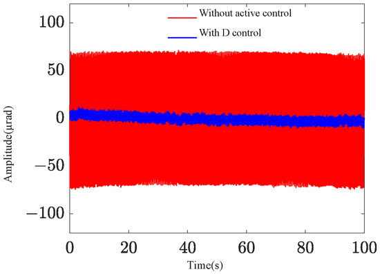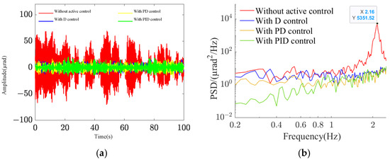 To evaluate the effectiveness of active vibration control at low frequencies, a random excitation with a frequency bandwidth of 0.2 Hz to 2.5 Hz and a root mean square value of 8.65 µrad is applied to the base. Figure 17 illustrates the vibration control effects under different controllers. The integrated platform’s fundamental frequency is observed to be 2.16 Hz, aligning with the expected design value. Analysis of the time-domain response and power spectral density graphs reveals that the payload’s response amplitude can be effectively controlled. Notably, the PID control demonstrates superior control at low frequencies, consistent with theoretical analysis predictions. Figure 18 depicts the D control effect at the fundamental frequency. The pitch–yaw angle response at the mass center plane decreases from approximately 70 µrad without active control to about 5 µrad, representing a reduction of approximately 23 dB.