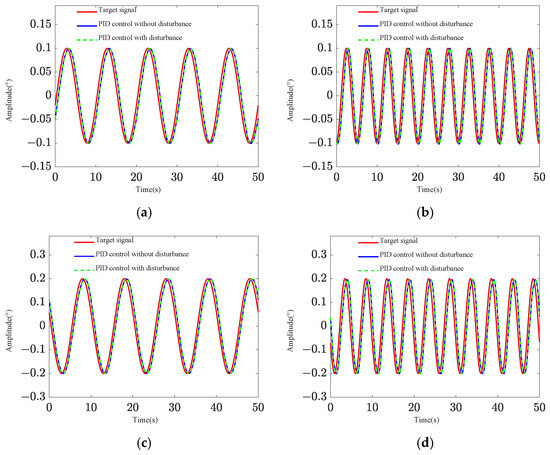 Tracking performance under varied pointing signals: (a) amplitude: 0.1°; frequency: 0.1 Hz; (b) amplitude: 0.1°; frequency: 0.2 Hz; (c) amplitude: 0.2°; frequency: 0.1 Hz; (d) amplitude: 0.2°; frequency: 0.2 Hz.