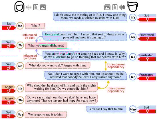 In ERC, understanding and utilizing contextual information is particularly important [7]. Capture of speaker dependency and temporal dependency can provide rich contextual understanding. Speaker dependency refers to emotional interactions between individuals in a conversation [8]. This dependency includes changes in not only the individual’s own emotional state, but also emotional interactions between different speakers. For example, as shown in Figure 1, an example of intra-speaker dependency is that in u7, the son expresses frustration, an emotional state that may have been influenced by his own previous utterances (u3, u5). An example of inter-speaker dependency is that in u10, the son expresses concern about his mother’s angry feelings, which may have been influenced by his mother’s angry utterance in u8 and u9. Temporal dependency involves changes in emotional states over time in a conversation. Past utterance influences the trajectory of future utterance, and future utterance may fill in missing information in the past utterance [9]. For example, as shown in Figure 1, ‘frustrated’ in u5 is influenced by ‘sad’ in u4, and it is also supplemented by the information of the emotion state of ‘sad’ of u6 at the next time step. Therefore, the ability to adequately capture speaker dependency and temporal dependency in a conversation is crucial to improve the performance of ERC. HiGRU [10] combined attention and recurrent neural networks to capture neighboring utterance through three main components, but it failed to take speaker dependency into account. To this end, DialogueGCN [11] captured inter-speaker dependence and intra-speaker dependence through a graph network, but it used only textual information and failed to take full advantage of complementarities between different modalities of information, which led to poor performance in complex emotion recognition tasks. Therefore, researchers started to focus on how to integrate information from different modalities using graph networks, proposing cross-modal multi-head attention mechanisms [12,13] and cross-modal feature complementation [14]. However, existing approaches mainly focus on fusing multimodal features and directly modeling the relationships, which cannot adequately capture speaker dependency and temporal dependency within and across modalities. This may lead to a degradation of the overall performance of the model when there are differences in the quality of information across unimodality.