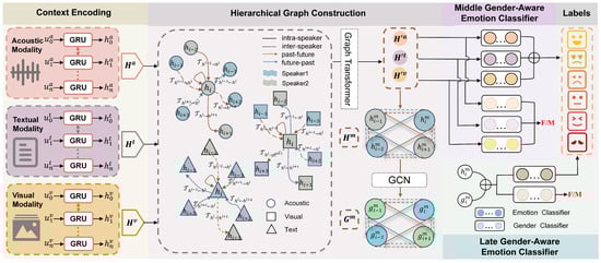 In the ERC scenario, each dialog contains M utterances , and each utterance incorporates information from three modalities: audio (), text (), and video (). The core task of ERC is to assign each utterance in the dialog a emotion label . Our model exploits the speaker dependency and temporal dependency within and across modalities, and proposes a hierarchical graph fusion strategy. In addition, in order to improve the accuracy of emotion recognition, a Mid-Late multilevel gender-aware strategy is adopted to incorporate gender information as an auxiliary task in the model training.