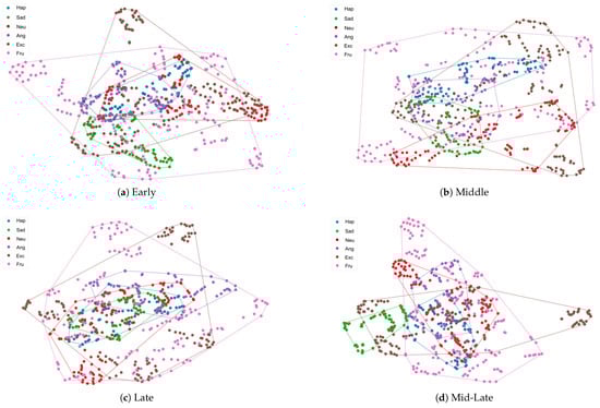 To better understand the effect of gender injection location on the model, we used t-SNE to visualize the potential representations learned by different gender information injection locations on the IEMOCAP test set. Figure 3a–c show the visualization results for gender information injected alone in the early, middle, and late stages, respectively, and Figure 3d shows the visualization results for gender information injected simultaneously in the middle and late stages. Compared with injecting gender information at early, middle, and late stages, our Mid-Late multilevel gender-aware strategy has significantly optimized the clustering of the same emotional category and increased the distance and clarity of boundaries between different emotional categories. Specifically, the representations of sad and happy are clearly distinguishable. Moreover, the overlapping areas of excited, frustrated, and neutral with other emotional categories have been significantly reduced. These results show that MiLaG is able to learn structured representations with clustered levels, improving the model’s ability to recognize emotion categories.