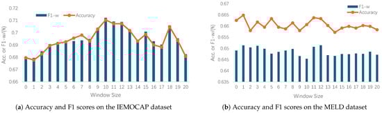 In this section, we discuss the effect of different window sizes on the performance of HGF-MiLaG. Figure 4a,b show the changes in accuracy and weighted F1 values of HGF-MiLaG corresponding to different window sizes on the IEMOCAP and MELD datasets, respectively.
