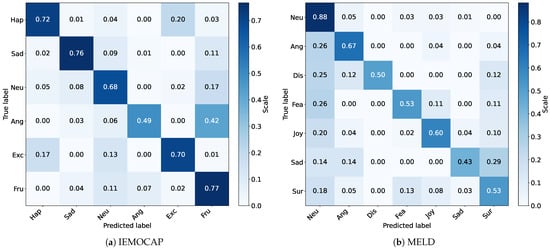 To further evaluate the performance of the model, we show in Figure 5 the confusion matrix of HGF-MiLaG on the IEMOCAP and MELD test sets, which is used to assess the quality of the model’s prediction output. With the confusion matrix on the IEMOCAP test set (Figure 5a), we observe that the HGF-MiLaG model has some limitations in distinguishing emotional nuances. For example, the model exhibits low discrimination in recognizing anger vs. frustrated and happy vs. excited. This suggests that the model has room for improvement in capturing subtle differences in emotion.