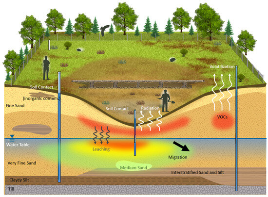 A typical nuclear legacy waste site contains radioactive substances such as uranium, plutonium, americium, cesium, strontium, and technetium, which are often found in soil, water, and sediments. There are also nonradioactive materials present, which include volatile organic compounds (VOCs), heavy metals, and chemical solvents. These hazardous materials can disperse in several ways: they may wash into nearby water sources such as the Ottawa River due to surface runoff, seep into groundwater, migrate through soil, or become airborne as dust. In addition, VOCs pose a special risk because they can evaporate, turn into gases, and pollute the air.