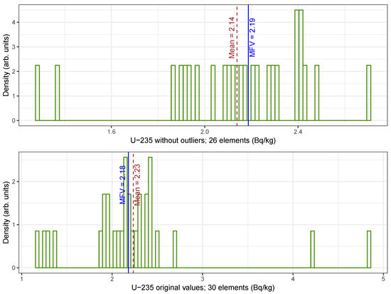 By combining the MFV method with bootstrapping, field data accuracy can be enhanced using existing historical data, thereby eliminating the need for additional experiments. In practical applications, the MFV method has been demonstrated to successfully manage outliers [14,15]. To provide an example of this, we include the uranium activity concentration dataset both with outliers and without. As the MFV approach focuses on minimizing information loss, integrating it with the bootstrapping techniques allows for more comprehensive and flexible averaging of the results.