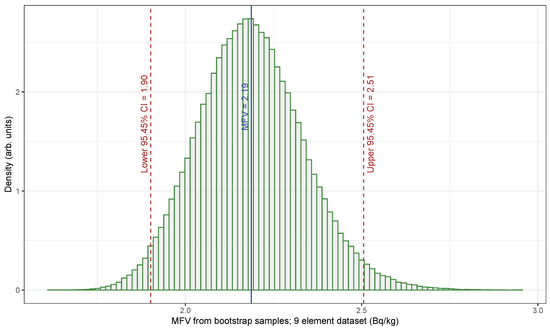 The plot in Figure 6 presents the MFV obtained through hybrid parametric bootstrapping (HPB) of the small dataset for NORM activity concentration, consisting of nine elements; also depicted are the upper and lower limits of the 95.45% confidence interval derived using the percentile method. The confidence interval at the 95.45% level was calculated using 210,000 bootstrap samples, spanning from [1.90, 2.51] Bq/kg. When applying the small NORM activity concentration dataset with nine elements to Equation (5), the UCL for , denoting a 95.45% confidence level, was determined to be 2.60 Bq/kg. This result is closely aligned with the HPB outcome from the MFV statistic, showing a 2.51 Bq/kg value, which indicates that the difference is not significant. The substantial number of bootstrap samples used in the HPB method is crucial, as it eliminates contributions from the analytical function and aids in considering both the values of the elements and their uncertainties in the relatively small dataset.