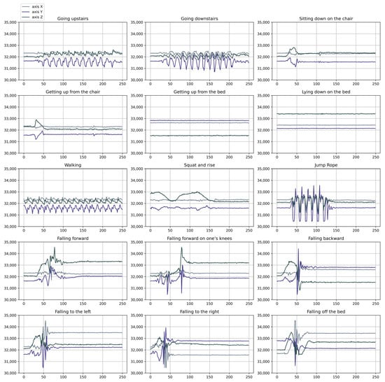 Numerous HAR systems have been developed using various approaches such as wearable sensors, video cameras, and Kinect sensors. Activity data collected through various sensors are used to recognize both simple and complex activities such as walking, running, sitting, lying, falling, and other daily living activities. In recent years, wearable devices equipped with sensors have gained popularity for monitoring human activities, driven by rapid advancements in sensor []. The most common approach for systems utilizing wearable devices is based on data acquired from a tri-axial accelerometer []. A tri-axial accelerometer measures increasing speed, tilt, inclination, rotation, vibration, and crash along the x, y, and z axes []. These measurements provide valuable data for HAR, where the key lies in feature extraction to identify meaningful patterns and representations related to various movements [].