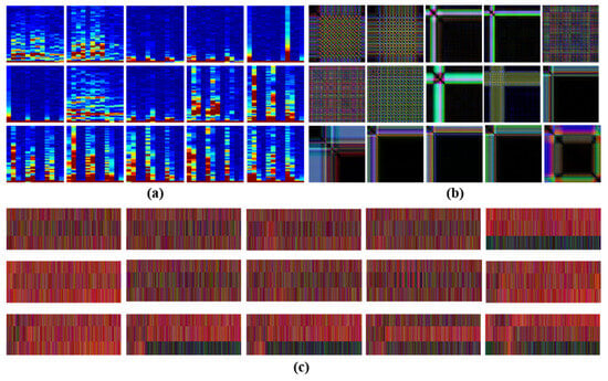 Images reconstructed by (a) spectrogram, (b) modified RP, and (c) modified MP.