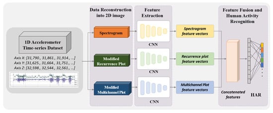In this context, there have been previous studies that convert one-dimensional time-series accelerometer data into two-dimensional image data for use in HAR research. Various studies have demonstrated improvements in HAR performance by transforming time-series data into images using techniques such as Fourier transform [,], recurrence plot [,,,], and multi-channel plot [], followed by their application in CNN models. Building on these advancements, several research methods such as hybrid, multi-branch, and ensemble HAR were proposed to improve the accuracy of HAR. Several studies have explored sensor fusion using accelerometer, gyroscope, and magnetometer data [,,,], as well as ensemble methods of two models combined [,,,,]. Additionally, research combining time-series data with short-time Fourier transform (STFT) [,] has been proposed.