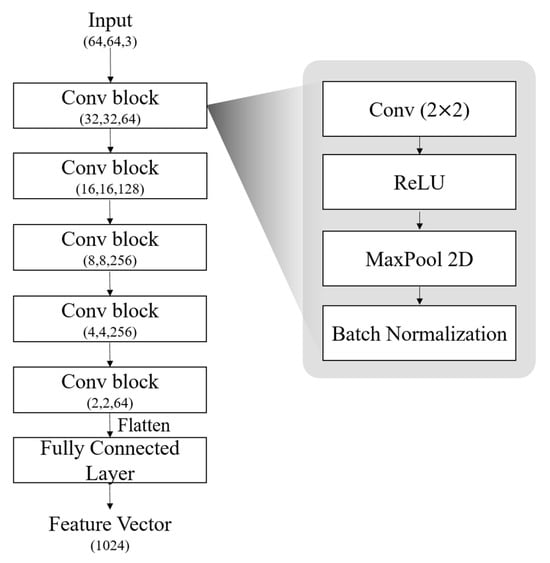 The detailed structures of convolutional blocks and each CNN model are shown in Figure 5. The input to the network is a three-channel image size of 64 × 64 × 3. The feature extraction process consists of a series of convolutional blocks, each performing downsampling while increasing the number of feature channels. At the final convolutional block, the output feature map has a spatial size of 2 × 2 with 64 channels, resulting in a flattened feature vector size of 256. This feature vector is then passed through a fully connected layer with 1024 units to enhance the representation capacity before being fed into the feature fusion stage. The feature vectors can reflect the distinct characteristics of the reconstructed input, and these are concatenated for feature fusion. The choice of maintaining a (2, 2, 64) shape at the last convolutional layer, rather than further increasing the number of channels, is intentional to balance feature extraction efficiency and computational cost. By keeping the final feature map compact, we reduce the number of trainable parameters while preserving essential feature information. This parameter reduction is particularly crucial in HAR, where models often need to be deployed on resource-constrained devices. A smaller number of parameters leads to lower memory requirements and faster inference times, making the model more suitable for real-time HAR applications.