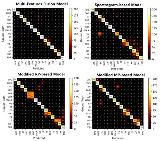 The spectrogram-based model exhibited notable confusion between ‘lying up on the bed’ and ‘lying down on the bed’, ‘squat and rise’, and ‘sitting on the chair’, as well as among the fall-related classes. This can be attributed to the model’s limited utilization of temporal information, which hindered its ability to effectively capture the subtle differences in brief and rapid movements. The misclassification of ‘squat and rise’ as ‘sitting on the chair’ was the most prominent issue, likely due to the similarity in their low-frequency patterns. The ‘squat and rise’ movement involves gradual changes in low-frequency components as the body lowers and rises, while the ‘sitting on the chair’ movement also generates strong low-frequency energy during the transition from standing to sitting. Furthermore, the use of a 10 s window size for STFT may have blurred finer movement details. The modified RP-based model focuses on capturing the recurrence and repetition of time-series data. The RP-based method performed poorly in distinguishing activities such as ‘lying up on the bed’ and ‘lying down on the bed’, ‘look left and fall’, and ‘look right and fall’, where the magnitudes of accelerometer data are similar, but the directional patterns are opposite. This limitation arises because the model interprets these activities as recurring patterns without effectively distinguishing their directional differences. Meanwhile, the modified MP-based model showed reduced performance in fall-related activities, likely due to the random noise and abrupt signal changes inherent to such activities. These challenges suggest that while individual models have strengths, their ability to distinguish similar activity patterns remains constrained by their respective feature representations.