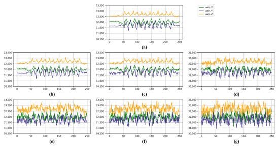 In the modified MP method, the raw accelerometer data values were normalized using a min–max scaler to scale them within the range of 0 to 255 before being mapped to an RGB image. The data values from the x, y, and z axes were then segmented into different parts: the integer, the first to second decimal places, and the third to fourth decimal places, respectively. These segmented values were assigned to the R, G, and B channels of the resulting image. To facilitate an understanding of this process, refer to Figure 3. By integrating the information from all three axes into a single image, subtle differences between activities can be visually represented. This method follows the approach presented in Hur T. et al. []. This process allows the continuous correlation of the signal to be reflected in the RGB channels by applying a slight distortion to the accelerometer data’s real numbers.