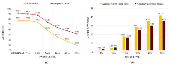 The proposed model achieves higher accuracy than the time-series model in the noise-free condition and consistently maintains better performance as noise levels increase, as shown in Figure 8a. Both models degrade when more noise is introduced, and the proposed model shows a smaller drop in performance. The bar charts shown in Figure 8b quantify how much performance declines compared to the original baseline, demonstrating that the time-series model is more vulnerable to noise. Overall, these results demonstrate that our method maintains higher accuracy and stability under noisy conditions compared to conventional time-series approaches. This suggests that our approach is more robust to real-world data imperfections. These findings highlight the potential of our approach for real-world applications where data contamination is inevitable, such as clinical or daily living settings.