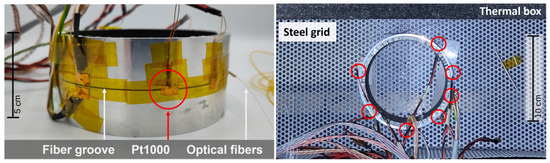 Ring-shaped test sample with two optical fibres in warm-up thermal box. Positions of Pt1000 are marked with red circle.
