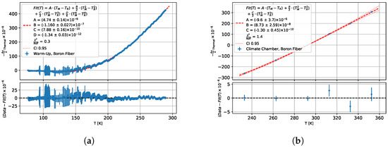 For the temperature sensitivity of the boron-doped fibre, a fourth-order polynomial was chosen for the temperature range 77–290 K and a third-order polynomial was selected for the temperature range 223–353 K. The results are visible in Figure 3a,b.