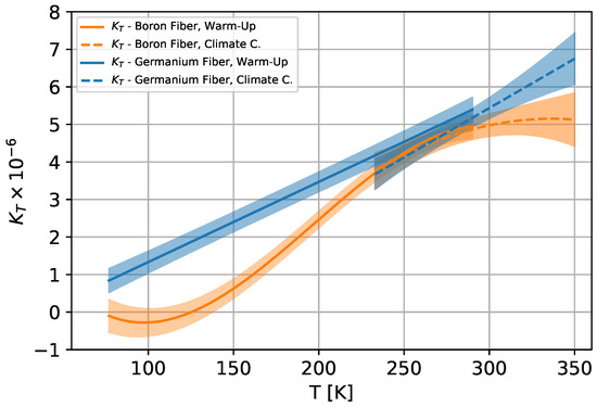 The measured data, i.e., an average value directly at one of the PT1000 sensors, of the boron-doped fibre of the ring sample for the range 77–353 K are shown in Figure 5 together with the respective predictions calculated with Equation (2) and the thermal expansion parameters from Girmen et al. for the Al6060 carrier material and a reference temperature of 233 K.