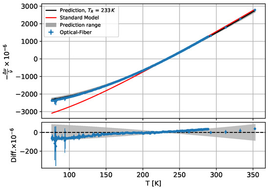It can be seen that the measured data lie within the uncertainty of the prediction model used, but a clear trend is visible, which will be discussed in Section 4. The effect of temperature determination from the systematic deviation of the boron fibre data on the model is discussed further in the following analysis of signal decoupling. However, the standard model does not describe the data curve in the lower temperature range.