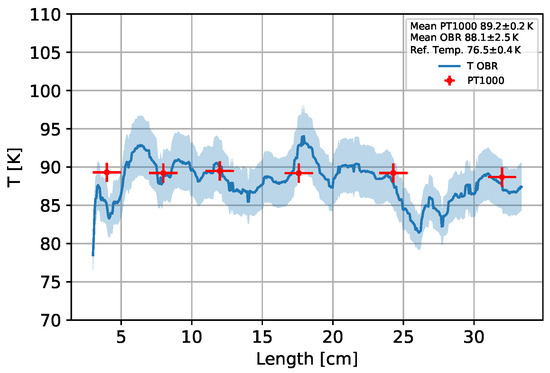 Figure 6 shows the temperature profile of the ring and the Pt1000 data for a temperature difference of about K based on the measured fibre data and the decoupling method described. As the average critical temperature of HTS tapes is approximately K, the temperature range from 78–110 K is investigated [36]. Figure 6 shows that the profile fluctuates within K, but the temperature is similar to the Pt1000 within a three-sigma environment. It could be detected that the germanium-doped fibre has a higher noise level than the boron-doped fibre. The blue area shows the statistical uncertainty on the temperature propagated from the statistical uncertainty for each fibre measurement point.