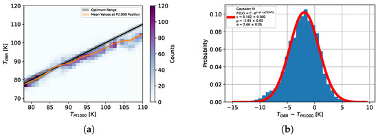 (a) A 2D histogram of the temperature determined with the fibres against the average Pt1000 temperature. (b) Differences between the fibre temperature and the mean Pt1000 temperature in each horizontal bin.
