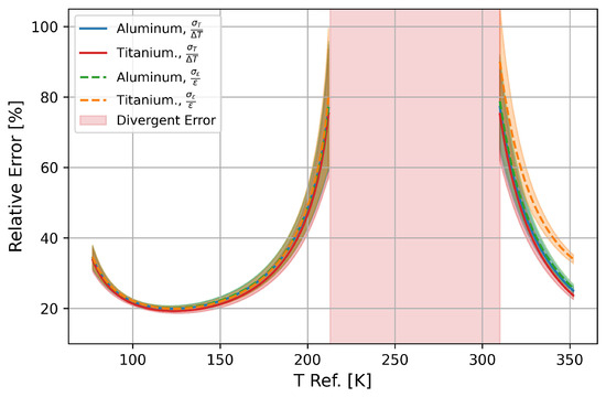 Figure 8 shows the mean relative error on the temperature difference (reference to measurement temperature) and the relative error on the strain for aluminium and titanium against the reference temperature. The uncertainty bands indicate the scatter. In addition, the relative uncertainties were not calculated in the range from K to K as the relative error diverges therein.