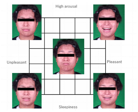 Recent psychological studies have reported that dimensions of subjective emotions, such as valence and arousal, correspond to facial expressions [4,5]. Namba et al. [4] asked participants to remember various affective valence and arousal states and express them through facial expressions; they acquired images of participants’ faces and analyzed facial action units (AUs) using the automated version of the Facial Action Coding System (FACS) [6] and found associations between several AUs and valence or arousal states. Zhang et al. [5] videotaped participants’ faces and assessed dynamic valence and arousal ratings while they observed emotion-inducing films. Automated AU analysis revealed several associations between AUs and dynamic ratings of valence or arousal. Although associations between affective states and facial expressions have long been investigated based on categorical emotion theory [7], empirical research has not clearly supported the theory of facial expressions associated with emotional categories (for reviews, see [8,9,10]). These findings suggest that it is possible to sense affective dimensions from facial expressions.
