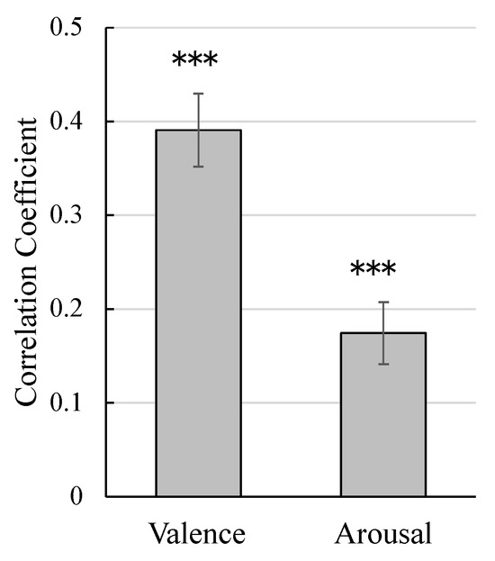 Figure 3 shows the correlation coefficients between actual and estimated valence and arousal values. The correlation coefficients were analyzed using single-sample t-tests against zero following Fisher transformation. The results showed that both valence and arousal rating prediction values were significantly positive ( and , , and ).