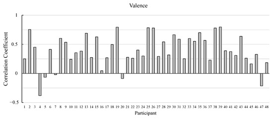 The correlation coefficients of most of the participants are positive values. The correlation coefficients of almost 90% of the participants (43 participants) are positive for valence. As for arousal, the correlation coefficients of more than 80% of the participants (40 participants) are positive.