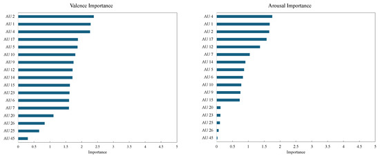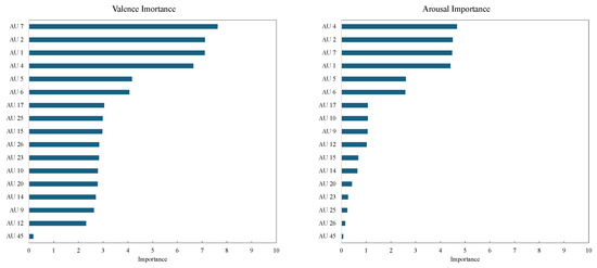 The graph on the right side of Figure 6 shows the drop-column importance for arousal. For arousal estimation, AU 4 (brow lowerer), AU 6 (cheek raiser), and AU 17 (chin raiser) exhibited high importance. This result suggests that in high-arousal states, increased facial muscle tension and activity, particularly in the cheeks and chin, contribute significantly to the model’s predictions. Furthermore, AU 7 (lid tightener) was identified as a highly important feature for arousal estimation, supporting the idea that expressions of surprise or tension are closely associated with high-arousal states.