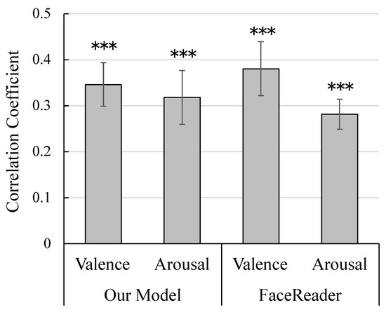 Figure 7 shows the correlation coefficients between actual and estimated valence and arousal ratings. The coefficients were Fisher-transformed and the values were subjected to single-sample t-tests against zero. The results showed that the valence and arousal ratings of both our model and FaceReader were significantly positive (, , , and , , , , , and , respectively).