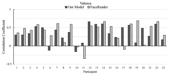 As for the estimation of valence ratings, our model outperformed FaceReader in 8 participants out of 23 participants. FaceReader has higher correlation coefficients for most participants; there are a few participants whose correlation coefficients calculated by our model are much higher than those by FaceReader such as participants 17 and 20.