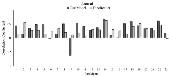 Regarding the estimation of arousal ratings, our model outperformed FaceReader in 16 participants out of 23 participants. In contrast to the estimation of valence ratings, our model shows better performance on average. However, the correlation coefficient of participant 9 is much lower compared to FaceReader. The test data by Zhang et al. [5] were created by showing five videos to the participants. The correlation coefficients are computed for the data including the five videos. When the correlation coefficients are separately computed for each video, the correlation coefficients of arousal for participant 9 are −0.113, 0.188, 0.004, 0.346, and 0.287. This stems from the high variance of the intensity values of arousal among the videos. This analysis result indicates that our AI model is comparable to FaceReader for every participant.