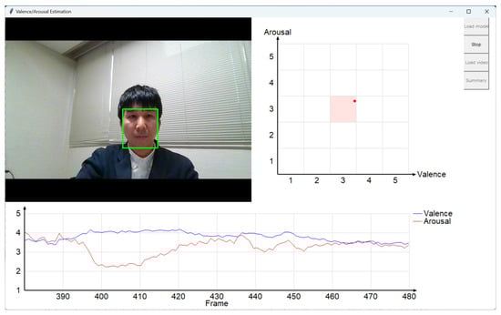 We developed a GUI-based system to visualize the estimation results of our AI model. The system estimates and visualizes the intensity of valence and arousal in real time from a video of a single face (Figure 11). Either a video file or a video data captured by a web camera can be used for the facial video. The GUI-based system and the estimation model are separated, and we can choose an estimation model before the estimation. This design makes it easy to use an estimation model trained by a user.