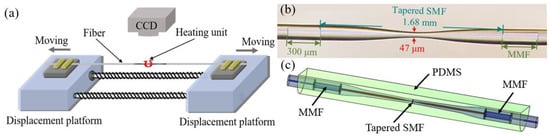 Figure 1c illustrates the proposed PDMS-coated multimode-tapered single-mode-multimode (MTSM) structure. The fabrication flow is as follows: first, a multimode-single mode-multimode (MSM) fiber structure was fabricated by our self-developed precision cutting and splicing technique [27]. The two MMFs with a length of 300 µm were embedded into an SMF at a spacing of 1 mm. Then, the single-mode fiber was tapered by a fusion tapering technique, as shown in Figure 1a, and the fabricated tapered single-mode fiber was welded in two multimode fibers. The MSM structure was placed in the fusion tapering system (GPX-3000, Vytran, Morganville, NJ, USA) and both ends were fixed on the fiber holder. The spacing between the two MMFs was designed to be the same as the width of the heating unit (1 mm). The CCD device makes the middle SMF of the MSM coincide with the heating unit, thus ensuring that the heating unit can accurately heat the central region of the middle SMF. The direction, speed, and time of movement of the two displacement platforms during the heating process are controlled by a computer to change the diameter of the tapered fiber waist. Figure 1b presents an optical microscope image of the prepared MTSM structure. It can be observed from the figure that the lengths of the two MMFs are 300 µm, while the tapering length and waist diameter of the tapered SMF are 1.68 mm and 47 µm, respectively. Next, the PDMS precursor (Sylgard 184A, Dow Corning Corporation, Midland, MI, USA) and the curing agent (Sylgard 184B, Dow Corning Corporation, Midland, MI, USA) were mixed in a ratio of 10:1 and left to stand for 3 h. When the bubbles disappeared, we poured the prepared mixture into the mold so that the MTSM structure fixed in the mold was completely submerged. Finally, the mold containing the PDMS mixture and MTSM structure was heated to 50 °C for 2 h, and when the PDMS was fully cured, the PDMS-coated MTSM structure temperature sensor was successfully obtained.