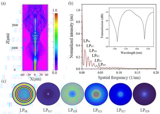 We established a simulation model through the finite difference beam propagating method (FD–BPM) to analyze the cladding modes and the spectral properties [31]. The core/cladding refractive indexes (RIs) of the SMF and the MMFs are both 1.455/1.449 in the model. The total length of the MTSM structure is 2.28 mm and the core/cladding diameters of the MMFs are 60/125 µm. The simulated optical field distribution of the bare MTSM structure is shown in Figure 2a. It can be observed that the loss of the light field is mainly generated in the first SMF–MMF welding zone. Due to the large diameter difference between the tapered SMF and the MMF, when the light enters the tapered SMF from the first MMF, some of the light will travel forward in the core, while the rest of the light will travel into the cladding to produce cladding modes, which will be coupled with the core mode in the second SMF–MMF fusion zone, and finally generate the interference patterns [32]. In addition, we also use the fast Fourier transform (FFT) method to transfer the data of the transmission spectrum to the spatial frequency spectrum [33]. As shown in Figure 2b, the spatial frequency spectrum with high fringe visibility is extracted by the FFT method, and there are six clusters of frequency components in the FFT outputs. The inset in Figure 2b is a typical calculated spectrum obtained by the scanning wavelength method. The scanning wavelength interval and mesh size in the calculation are 0.2 nm and 0.02 µm, respectively. Figure 2c shows the calculated electric field distribution of the six cladding modes. From these mode field profiles, we can see that as the mode order increases, the electric field intensity gradually decreases. In these six cladding modes, LP08 and LP017 play a major role in constructing the interference spectrum.