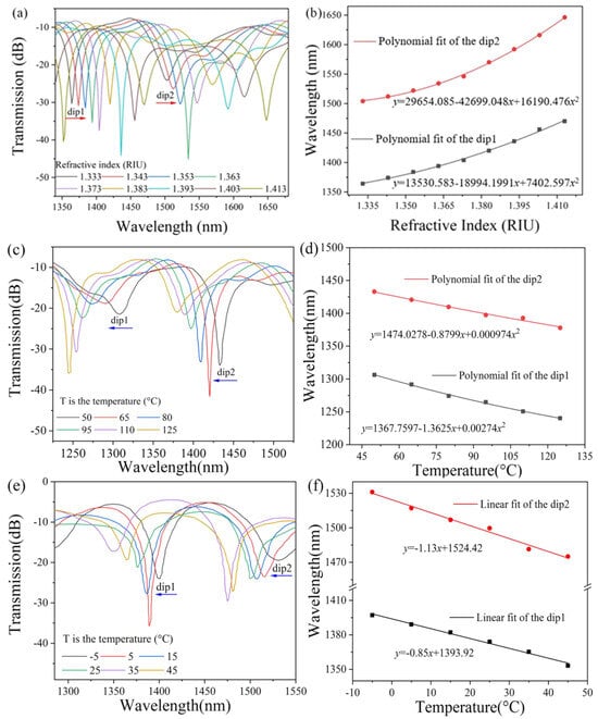 Figure 3a shows the simulated spectrum of the bare MTSM structure without PDMS coating corresponding to different external RIs. When the RI increases from 1.333 to 1.413, the interference fringes shift significantly towards a longer wavelength. The relationship between the resonance central wavelength and the external RI is shown in Figure 3b. As the external RI increases, the shift speed of the resonant dips wavelength also increases, and the RI sensitivity of the two resonant dips is 1925.54 nm/RIU (dip1) and 3055.24 nm/RIU (dip2) at RIU = 1.413. Because the TOC of quartz silica is low, the bare MTSM structure without PDMS coating is almost insensitive to changes in temperature. In view of this, we can obtain a high-sensitivity temperature sensor by coating the MTSM structure with a high TOC material (−4.66 × 10−4/°C) like PDMS [34]. The change in the RI of PDMS regarding temperature can be expressed as: RIU = 1.4176 − T × 4.5 × 10−4 [35,36]. From this formula, it is easy to calculate that as the temperature increases from 50 °C to 125 °C, the RI decreases correspondingly from 1.3951 to 1.361. The simulated spectra of the PDMS-coated MTSM structure corresponding to different external temperatures are shown in Figure 3c. When the temperature increases from 50 °C to 125 °C, the interference fringes shift significantly towards a shorter wavelength. The relationship between the resonance central wavelength and temperature is shown in Figure 3d. The temperature sensitivity of the two resonant dips is determined to be −0.65 nm/°C (dip1) and −0.87 nm/°C (dip2) at T = 50 °C. When the temperature increases from −5 °C to 45 °C, the interference fringes shift towards a shorter wavelength, as shown in Figure 3e. As illustrated in Figure 3f, the temperature sensitivity of the two resonant dips is determined to be −0.85 nm/°C (dip1) and −1.13 nm/°C (dip2). Due to longer wavelengths usually having a stronger evanescent field, the sensitivity of dip2 is higher than that of dip1.