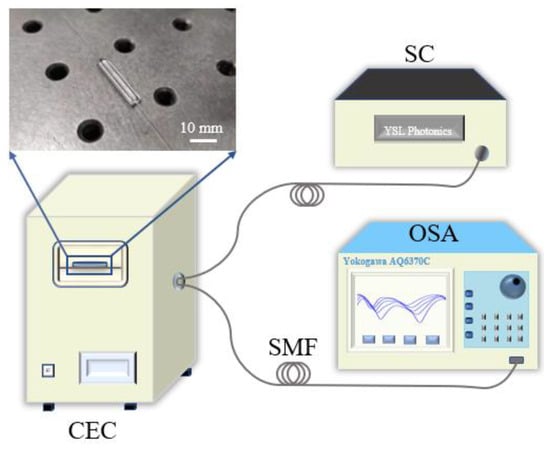 The temperature sensing experimental setup is illustrated in Figure 4, which includes a super-continuous light source (SC), a controlled environmental chamber (CEC), and an optical spectrometer analyzer (OSA). The sensor was fixed on a glass slide and placed in a CEC. The two ends of the sensor were respectively connected with the SC (YSL Photonics, Wuhan, China, SC-5) and the OSA (Yokogawa, Tokyo, Japan, AQ6370C) with a wavelength resolution of 0.01 nm. In this temperature sensing test, the CEC was used to regulate the environmental temperature range from −5 °C to 125 °C with a temperature resolution of 0.1 °C. In order to make the measurement more accurate, it is necessary to maintain the temperature for 10 min before the next test. The corresponding transmitted spectra are recorded in the optical spectrometer, and the final sensitivity of the temperature sensors can be obtained by analyzing spectral data at different temperatures.